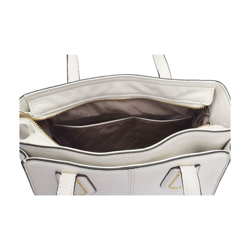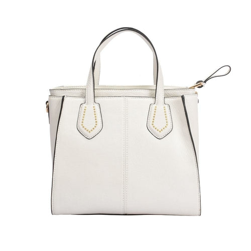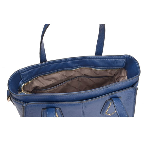 Smooth leather bag with handles. Includes adjustable cross body/ shoulder strap. 2 side compartments with magnetic closure. 1 middle compartment with zip closure. Silver metal detailing.
